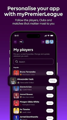 Rendi l'esperienza Premier League unica e personale con myPremierLeague. Scegli le tue squadre, i giocatori preferiti e le partite del cuore per ricevere un flusso di notizie, video e storie su misura per te. Le notifiche intelligenti ti assicurano di essere il primo a conoscere le formazioni, i gol e gli aggiornamenti più significativi. Per gli appassionati del fantacalcio, Premier League offre la gestione completa della tua squadra di Fantasy Premier League direttamente dal tuo dispositivo, permettendoti di seguire i punti in tempo reale e partecipare alle modalità Classica, Draft e Challenge. E se ami ascoltare, Premier League Radio ti porta la cronaca live e l'analisi approfondita di ogni partita, ovunque tu sia (soggetto a restrizioni territoriali).