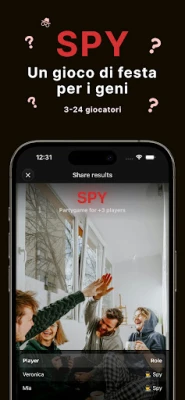 Scopri "Spia - Trova la spia", il party game definitivo di inganno e deduzione. Bluffa, tradisci e sopravvivi in sfide avvincenti per amici e famiglie. Smaschera la spia o mimetizzati, usando solo un telefono. Porta tensione, risate e dramma istantanei ovunque.